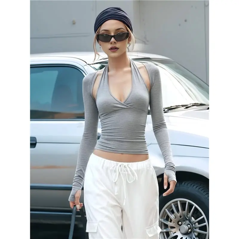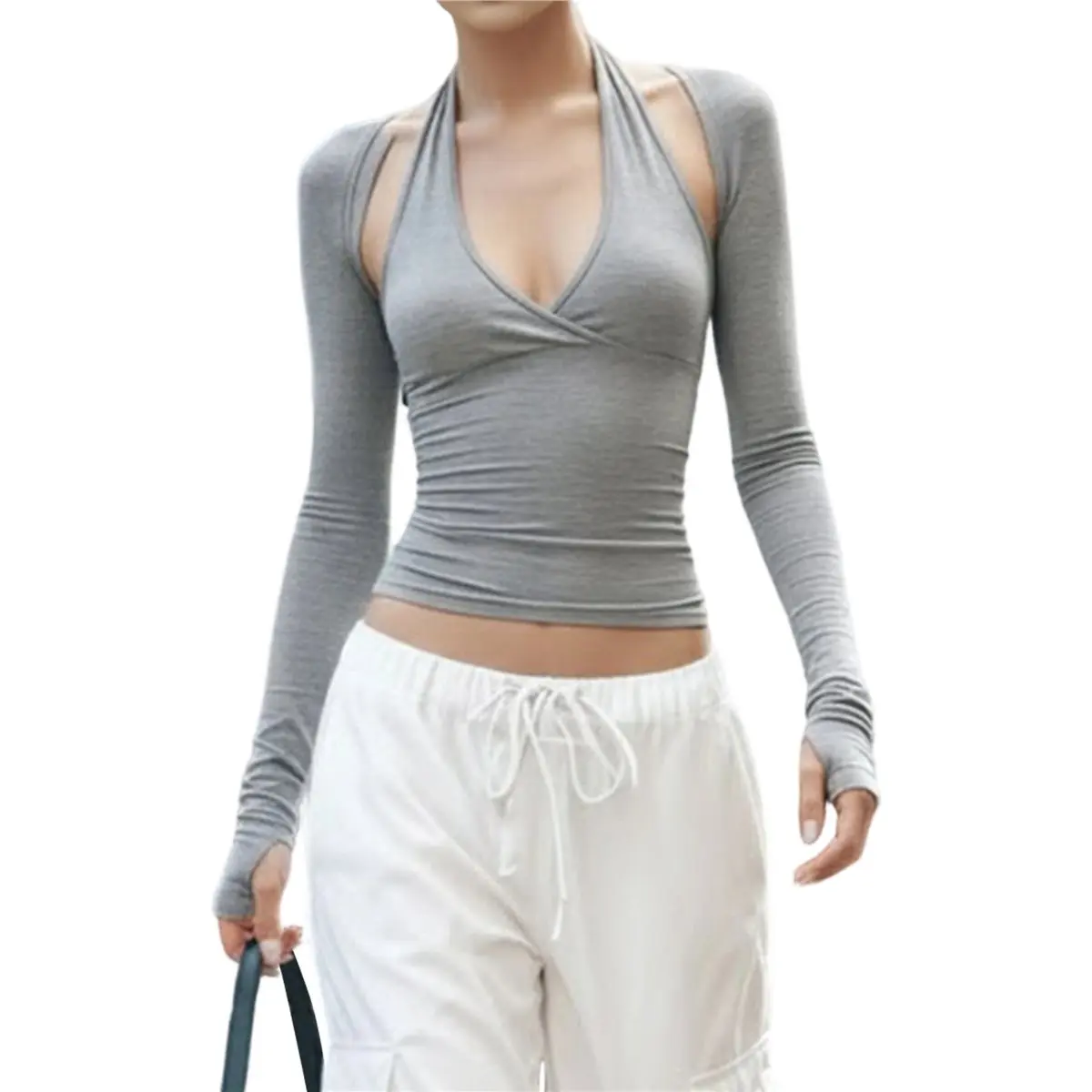 CYL-Women Wrap Top Y2k Long Sleeve Ballet Workout Yoga Shirt